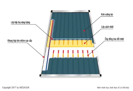 Cấu tạo tấm phẳng năng lượng mặt trời chịu áp Megasun đạt nhiều tiêu chuẩn Quốc Tế, hiệu suất hấp thụ cực nhanh.